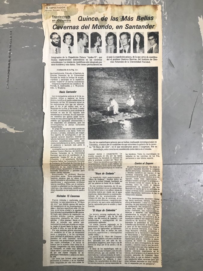 Polska wyprawa do jaskiń Kolumbii. Współorganizowana przez Wydział Nauk Przyrodniczych Uniwersytetu Humboldta w Bogocie. Wyprawa odkryła kilkanaście nowych jaskiń, jedna z nich, La Caverna del Aquila, jest obecnie najdłuższą jaskinią Kolumbii (7 km).  Wyprawa przeszła także do dna jaskininię Hoyo del Aire o głębokości -280m.